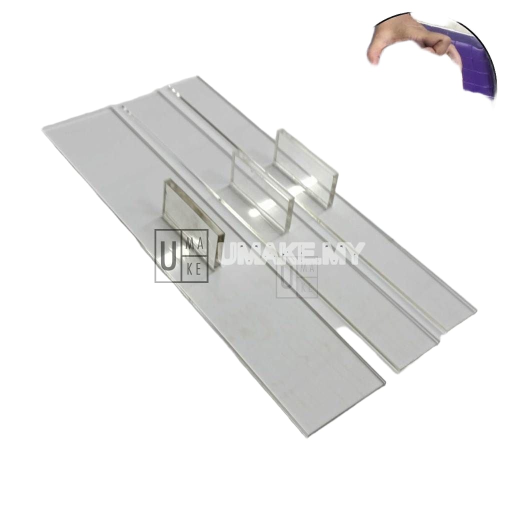 Precision acrylic ruler set for cutting kuih talam, agar-agar, brownies, kek lapis, and pudding into uniform pieces. Made from 3mm acrylic — thicker and stronger than competitor 2mm versions. Available in 8, 10, and 12-inch sets with multiple widths (25mm, 30mm, 50mm) for different slice sizes. Creates neat, professional-looking cuts every time.