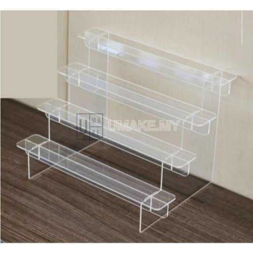 Clear acrylic tiered display riser for organizing and showcasing collectibles, figures, cosmetics, and accessories. Smooth edges with no-glue snap assembly. Available in 1 to 4 tiers. Width: 295mm. Made from durable acrylic with raised tiers that highlight displayed items.