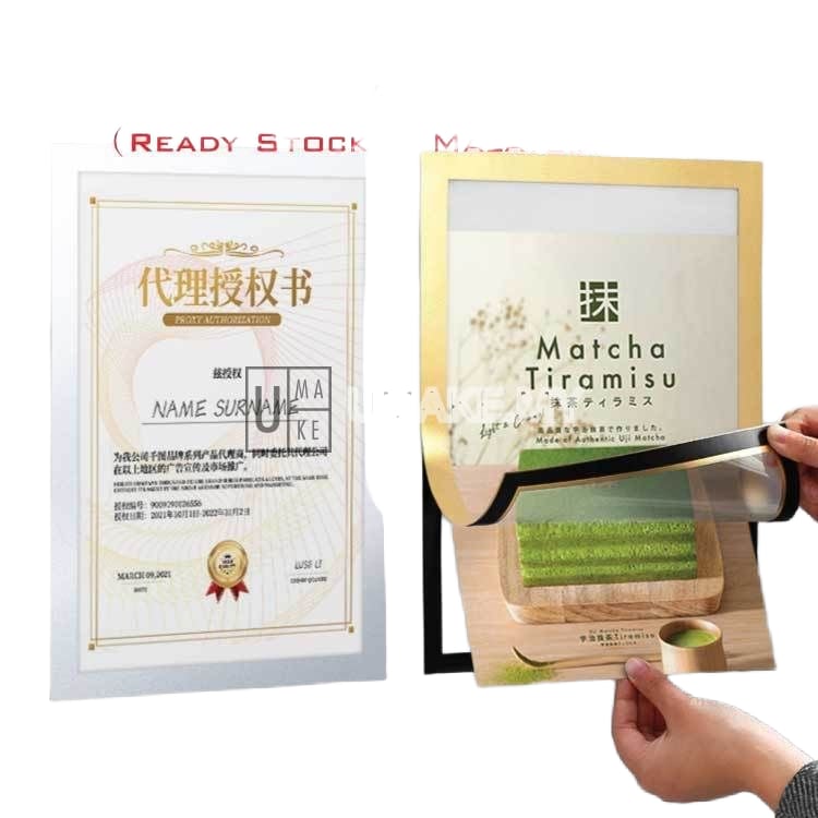 Self-adhesive magnetic display board frame for posters, certificates, and advertisements. Easy snap-open magnetic edge for quick content changes. Available in A4 and A3 sizes. Elegant champagne gold and platinum silver colour options. Ready to install with adhesive backing.
