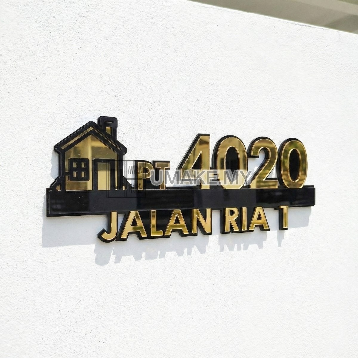 3D layered acrylic house number plate with premium multi-layer construction. Total thickness: 7mm (three 2mm acrylic layers + 1mm adhesive). UV-resistant and rain-resistant — suitable for outdoor and indoor use. Size: 295 x 150mm. Available in tape-mount or drill-mount versions. Custom house number and street name. Ships within 2 working days. Made in Malaysia by UMAKE.