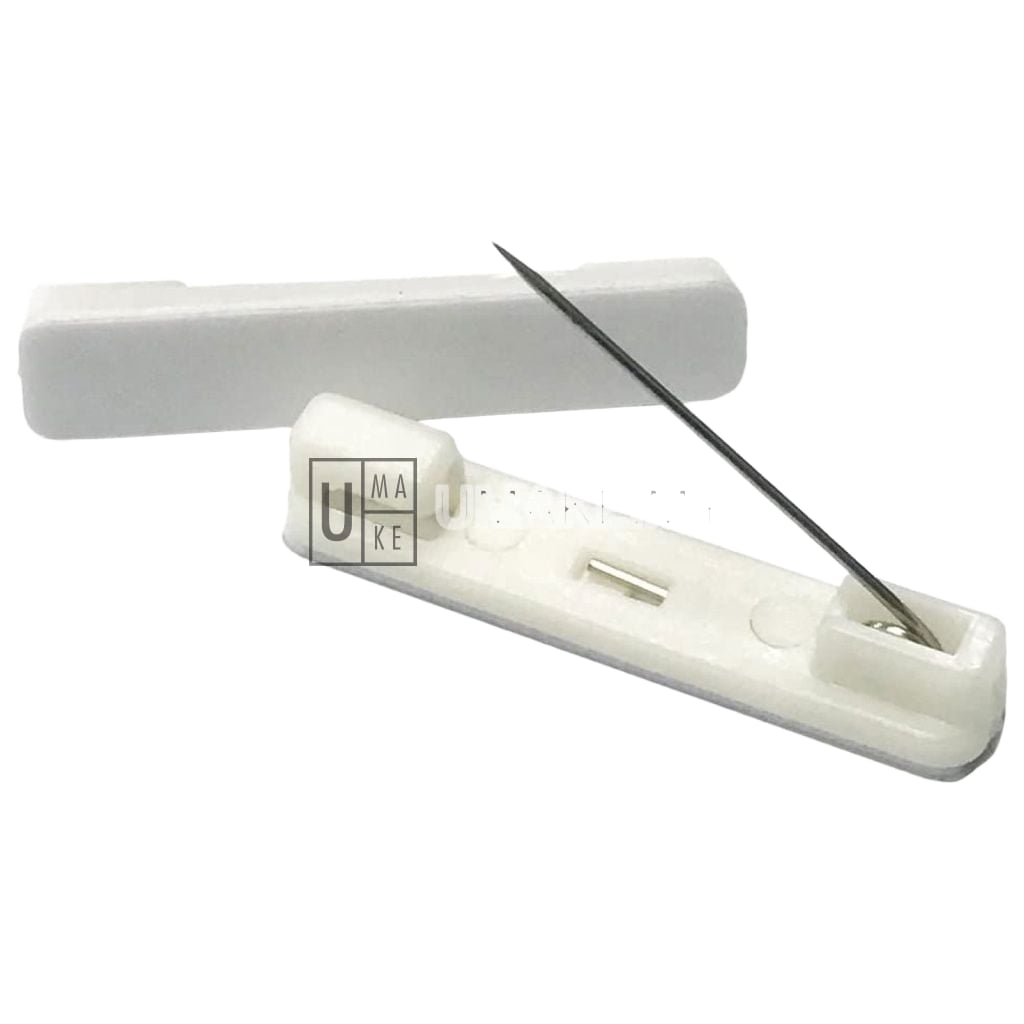 Single name tag pin back clip in white plastic with sharp needle. 1.75cm x 3.7cm size. No tape included — attach with super glue or acrylic cement. Lightweight and compact. Budget-friendly option for DIY name tag projects.