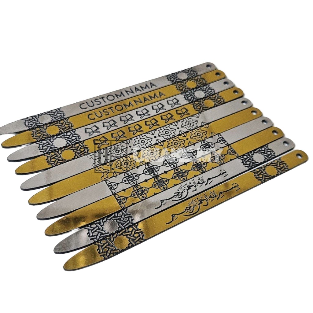 Elegant Quran reading pointer and bookmark made from laser-cut acrylic in gold or silver finish. Customisable with your name in Rumi, Jawi, or both. Beautiful gift for Quran readers, students, and as cenderahati for Islamic events.