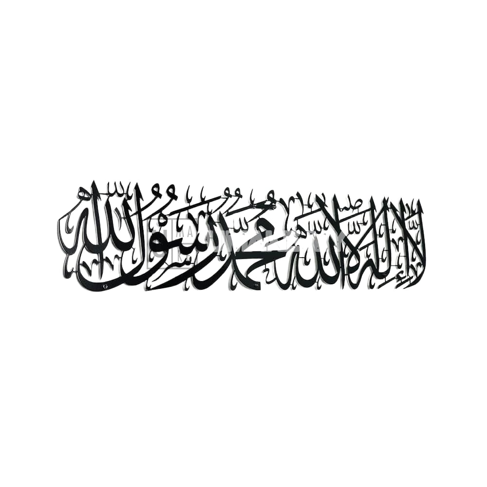 Shahada (Islamic declaration of faith) wall art in Kufi calligraphy, laser-cut from 2mm steel. Available in large sizes: 600mm, 900mm, and 1200mm widths. Powder-coated finish with 3D floating effect. Includes screws and spacers for installation.