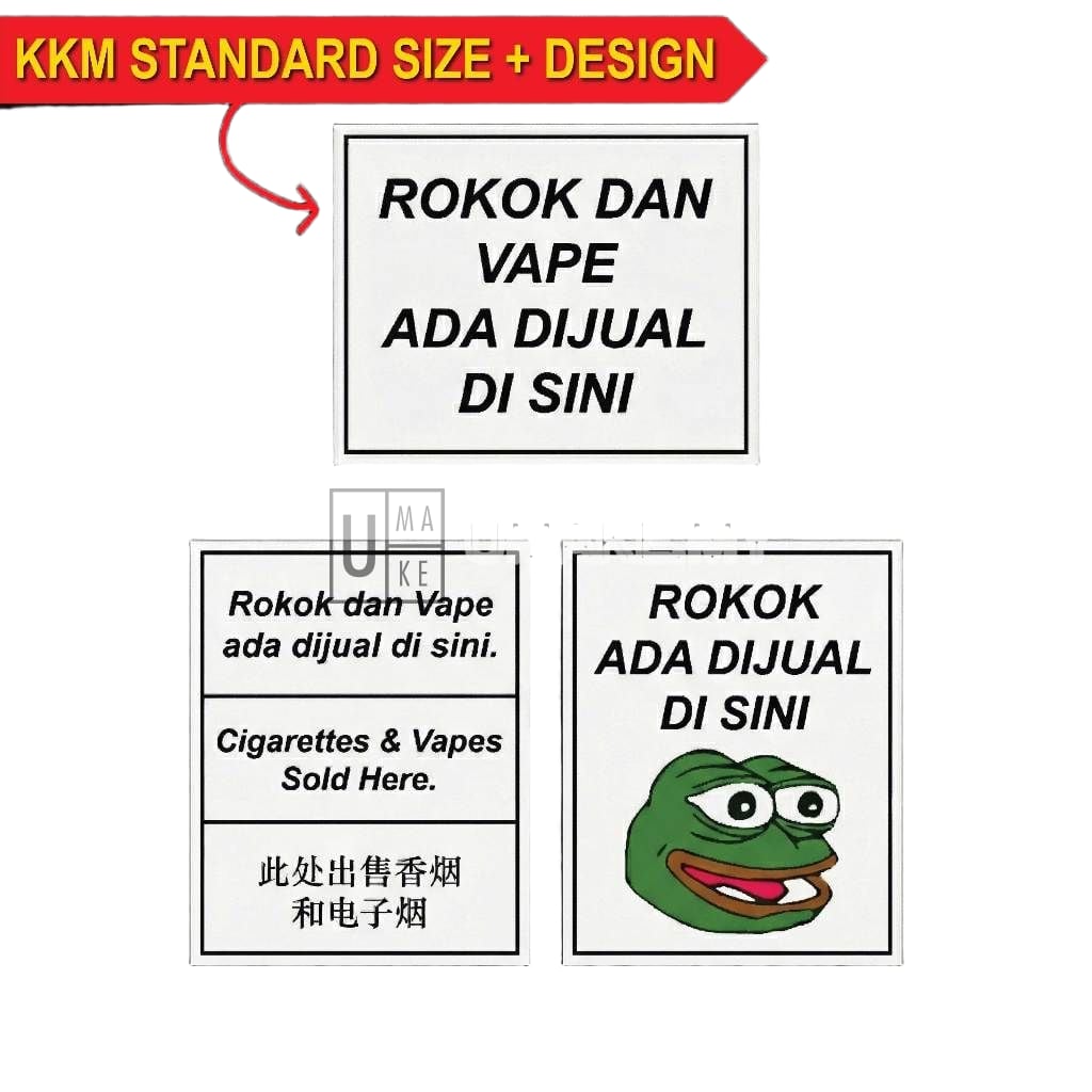 Premium vape retail signage for storefronts and cashier counters. KKM standard compliant designs on rigid board (not cheap stickers). Multiple styles: standard professional, multi-language (EN/CN), and creative designs. High visibility typography. Easy mount with double-sided tape.