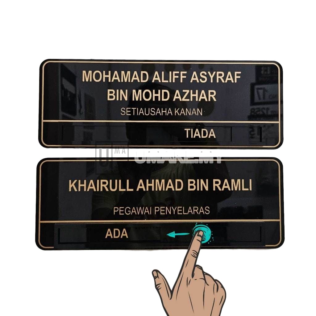 Sliding door sign for indicating room availability — Vacant/Occupied, Ada/Tiada, or In/Out. Made from premium acrylic in gold or silver finish, 300x110mm. Customisable with name and position. Easy installation with acrylic foam tape.
