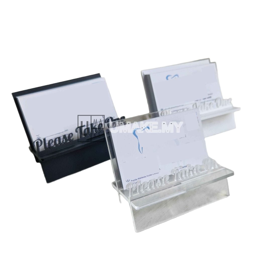Modern acrylic business card holder with 'Please Take One' text. Available in black, white or transparent. Separates into three pieces for easy storage and portability to roadshows and events. Quick snap-together assembly with stable base for holding multiple name cards. Clean professional appearance for reception desks, exhibitions and counters.