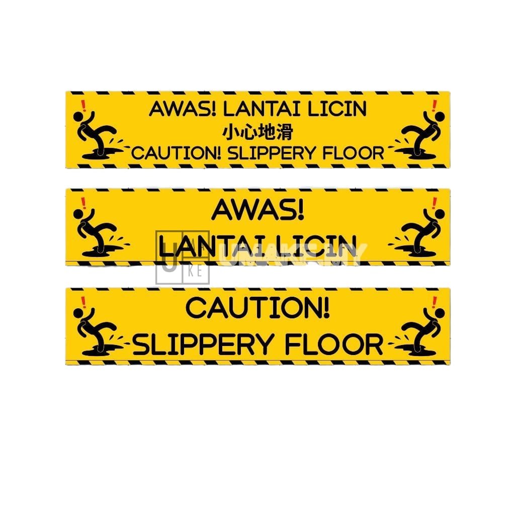 Caution slippery floor acrylic sign with bilingual English and Malay text. Made from high-quality Grade A acrylic — not a cheap sticker. Waterproof, scratch-proof and removable without residue. Clear glass-like finish for professional appearance. Standard 30cm x 6cm size. Includes anti-residue tape for easy mounting on any surface. Proudly made in Malaysia by UMAKE Design.