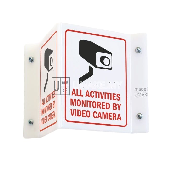V-shaped projecting CCTV security sign visible from multiple directions in hallways and corridors. Made from heavy-duty 3mm white acrylic with professional UV direct print that will not peel, fade or bubble. Available in 6x6 inch or 8x8 inch per side, projecting approximately 4 inches from the wall. Includes free screws and heavy-duty double-sided tape for two installation options. Waterproof and suitable for indoor and semi-outdoor use. Polished edges with rounded corners for a clean, safe finish.