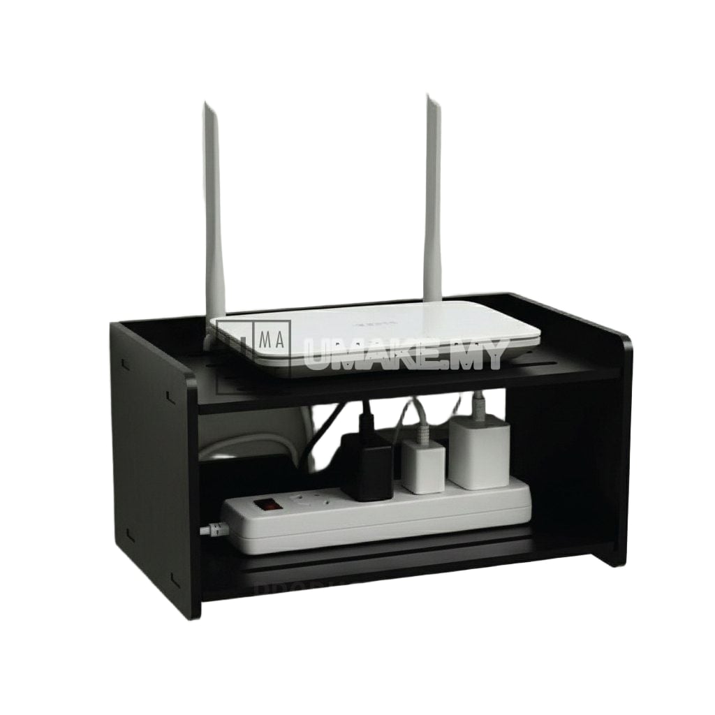 PVC WiFi router and modem storage rack with cable management. Fits standard Malaysian routers (TM Unifi, Maxis, Time), TV boxes, and power strips. Open-slot design prevents overheating with maximum airflow. 2-in-1 design: desktop placement or wall mount. Easy slot-in DIY assembly in 5 minutes — no tools needed. Available in white or black, 2-layer or 3-layer. Made from high-density water-resistant PVC foam board. Made in Malaysia by UMAKE.
